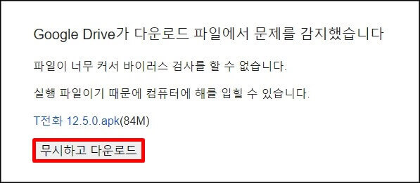 그럼 이제 구버전인 t전화 설치를 진행해보자. 위의 이미지를 클릭하면 apk 파일 다운로드 창으로 이동되는데 좀 더 편하게 파일로 첨부하려고 하다가 용량이 커서 구글 드라이브에 올려놓았으니 해당 페이지로 이동해서 다운로드 버튼을 누르고 설치하면 된다.