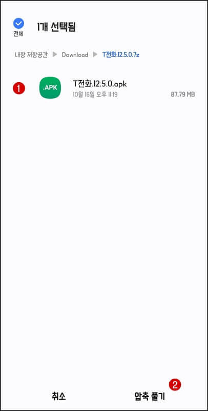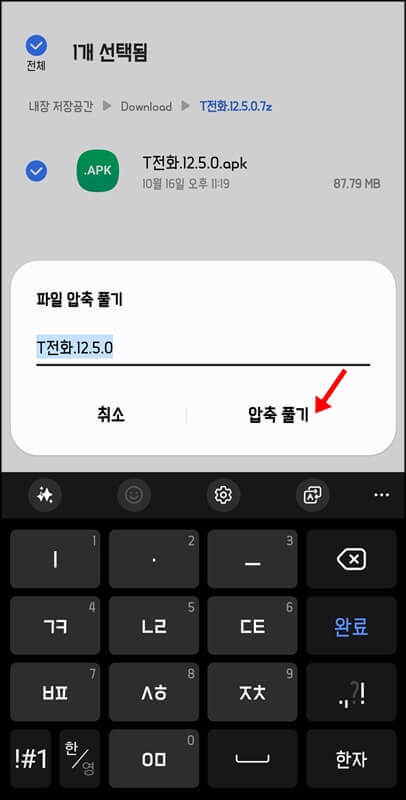 다운로드가 완료되면 핸드폰 내파일 > 다운로드 순으로 들어가서 방금 전 다운로드한 t전화 apk 파일을 찾아 압축 풀기를 진행해 준다.