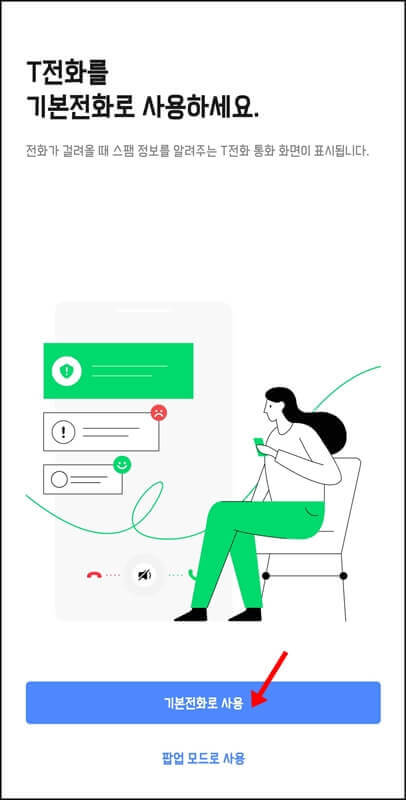 설치가 끝났다면 해당앱을 실행하여 t전화 권한 허용을 해주고 기본전화로 사용을 누른 뒤 한번 더 t전화에 체크하면 된다.