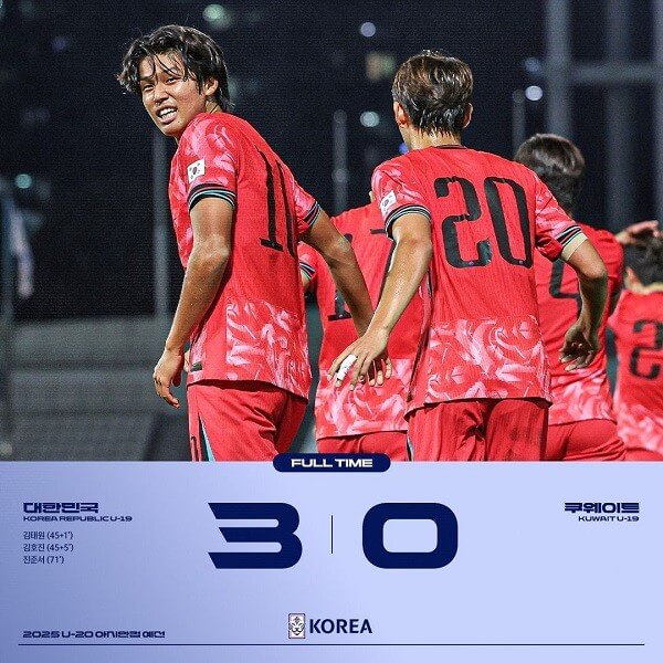 2025 FIFA U-20 월드컵에 진출할 목표를 가지고있는 한국은 U-20 아시안컵 예선에서 쿠웨이트와 첫 경기를 치르고 3대 0으로 승리했다. 한국은 전반 추가 시간에 김결이 밀어준 공을 김태원이 오른발 슈팅으로 첫 골을 넣었고, 이후 김호진이 올린 프리킥이 그대로 골대 안으로 들어가며 전반 추가시간에만 두 골을 넣었다.